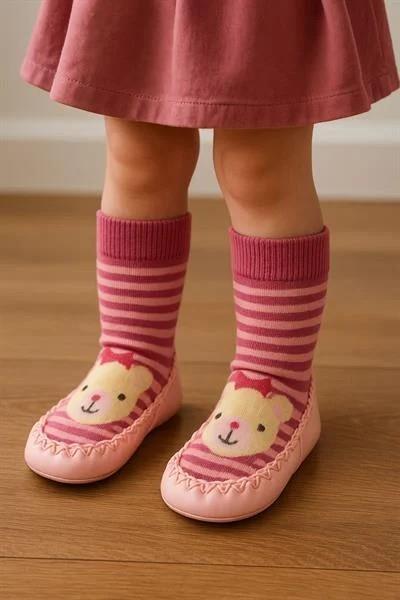 Çocuk Ayıcık Desenli Makosen Soket Çorap Patik Panduf – Kaydırmaz Ev & Anaokulu Ayakkabısı Pembe (22501G7038)