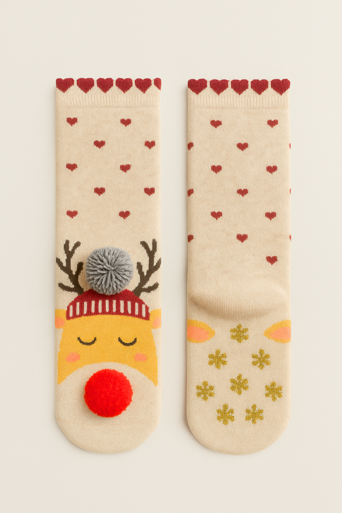Minik ayaklar için sıcacık, sevimli ve eğlenceli bir dokunuş! Bu Noel temalı geyik desenli çocuk çorapları, yumuşak dokusu ve üç boyutlu ponpon detaylarıyla çocukların favorisi olacak. Kalpli desenleri ve kırmızı burunlu geyik tasarımıyla kış mevsimini daha keyifli hale getirir.