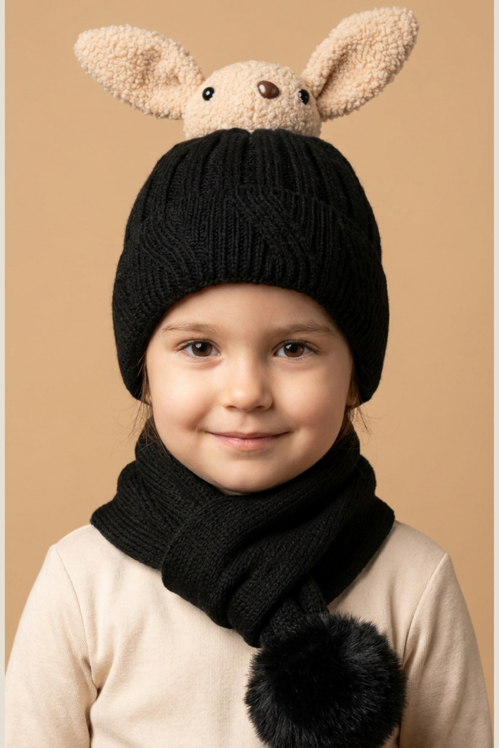 Tavşan figürlü siyah çocuk şapka atkı takımı, sevimli tasarımı ve sıcak tutan yapısıyla çocukların kış aylarında rahatlıkla kullanabileceği ideal bir settir. Üzerindeki tavşan detayları sayesinde eğlenceli ve dikkat çekici bir görünüm sunar.