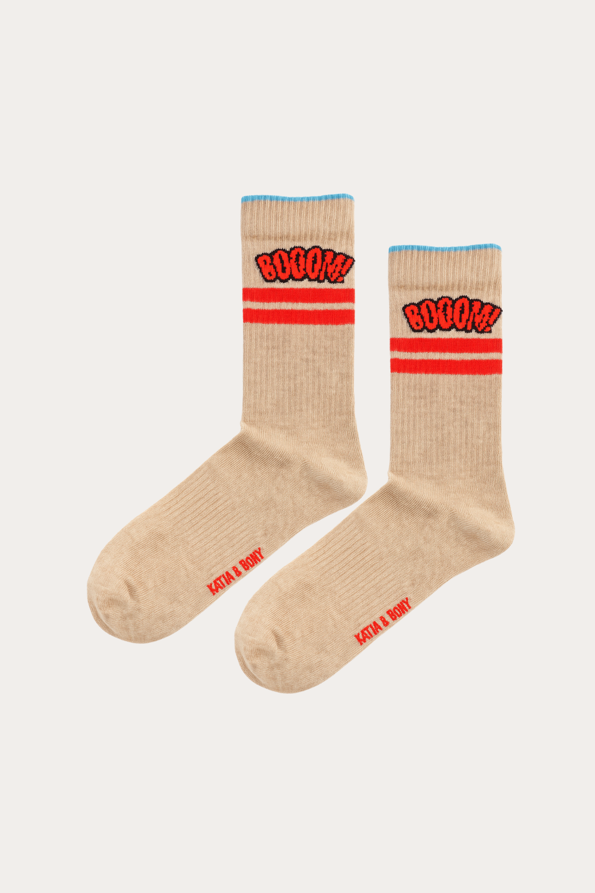 Stil sahibi adımlar için tasarlanan “BOOOM!” Unisex Çorap, rahatlık ve eğlenceyi bir araya getiriyor. Bej ton üzerine kırmızı çizgiler ve üst kısmındaki enerjik “BOOOM!” detayıyla dinamizmi yansıtır. Tabanında yer alan Katia & Bony logosu ise modern bir dokunuş katar.
